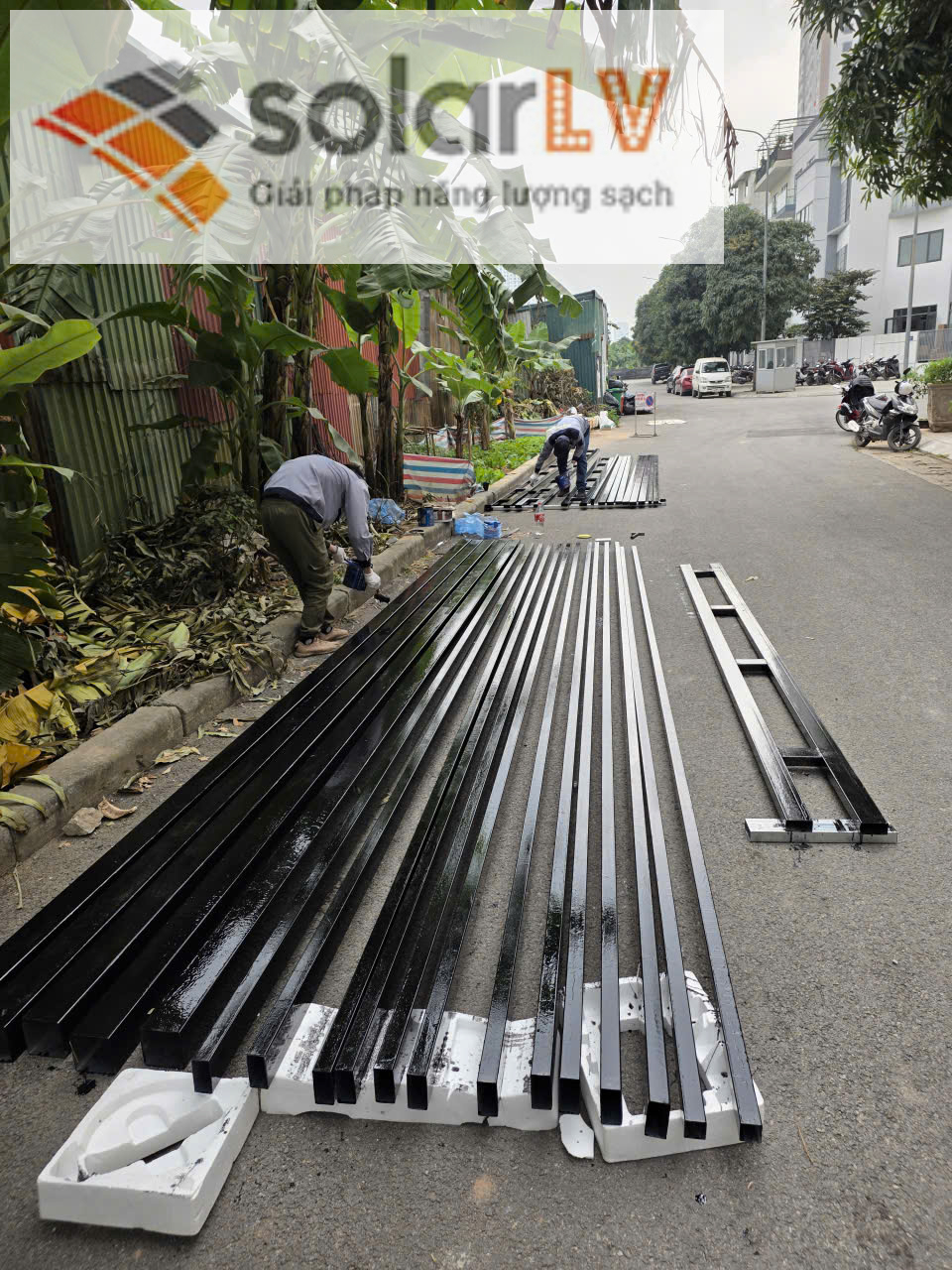 Yêu cầu kỹ thuật: Long Vũ Solar hỗ trợ lắp đặt trên mọi loại địa hình: mái tôn, mái bê tông phẳng hoặc hệ thống giàn khung sân thượng. Hình ảnh thực tế cho thấy các tấm pin được sắp xếp đồng bộ trên khung nhôm định hình cao cấp, đảm bảo an toàn trước gió bão tại miền Bắc.