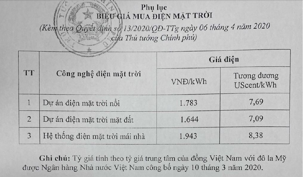 - Giá mua điện: Theo Quyết định 13 của Thủ tướng Chính phủ , ngày 6/4/2020 thì biểu giá mua điện mặt trời theo bảng dưới đây và áp dụng trong vòng 20 năm.