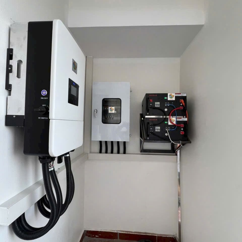 Hệ thống này vừa sử dụng điện mặt trời trực tiếp, vừa sạc pin lưu trữ để dùng vào ban đêm hoặc khi mất điện.