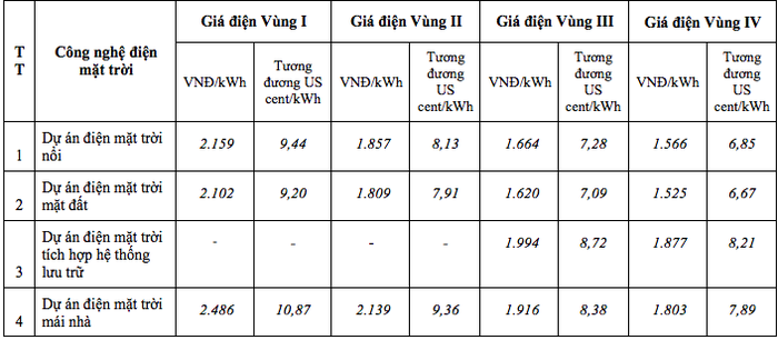 -Tập đoàn Điện lực Việt nam cũng đang trình dự thảo về giá mua điện từ các dự án nhà máy điện mặt trời, qua đó giá sẽ được điều chỉnh theo 4 vùng và 4 cách thức đầu tư nhà máy điện, với điện mặt trời áp mái Hộ gia đình vẫn giữ nguyên ở mức 9,35 cents/1kW.