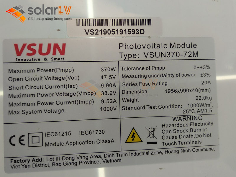27 tấm pin năng lượng mặt trời Mono VSUN – công suất 370Wp/tấm