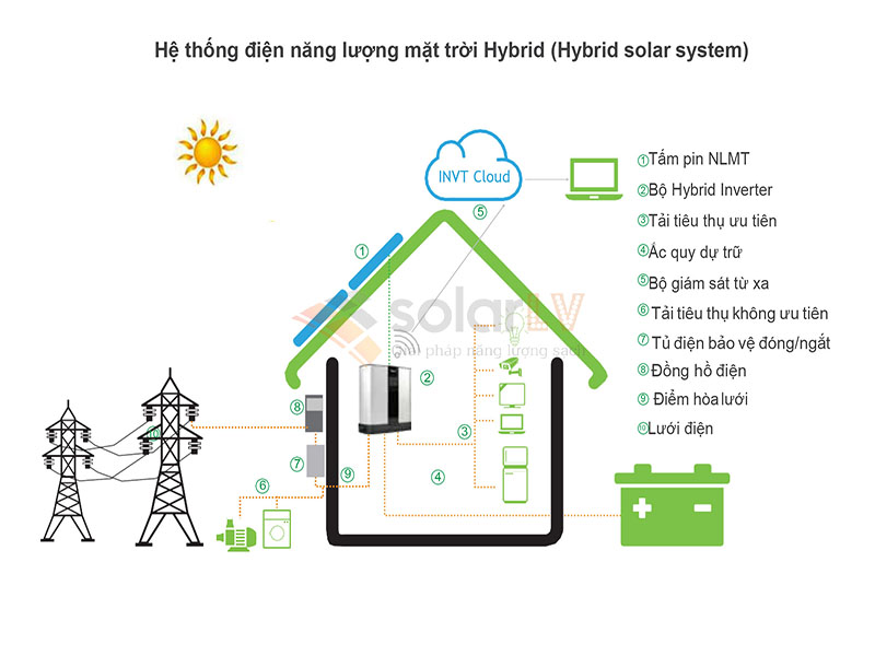• Nếu nguồn năng lượng mặt trời dư sẽ được hòa vào lưới điện quốc gia. Khi nguồn năng lượng mặt trời thiếu, hệ thống sẽ bổ sung nguồn điện lưới để cung cấp cho các thiết bị điện và sạc ắc quy.
