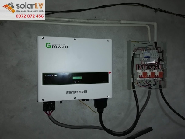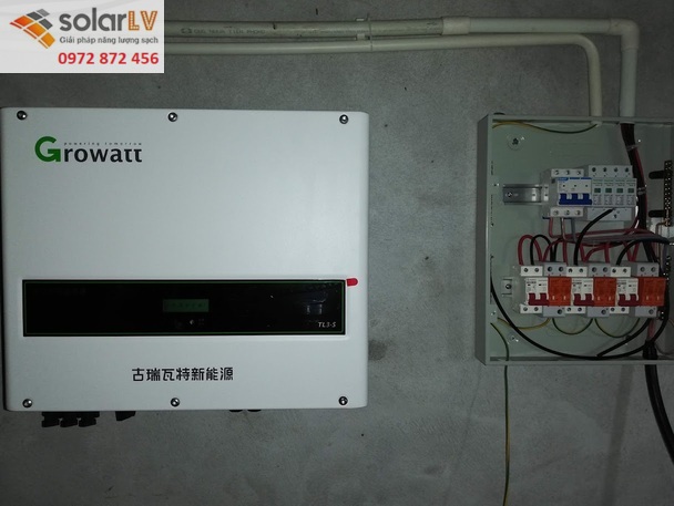 Cài đặt tấm pin và inverter: 34 tấm pin 450W được cố định trên ray nhôm, kết nối với bộ biến tần 3 pha Growatt và tủ điện 3 pha.