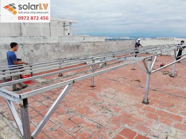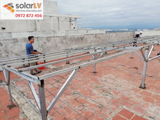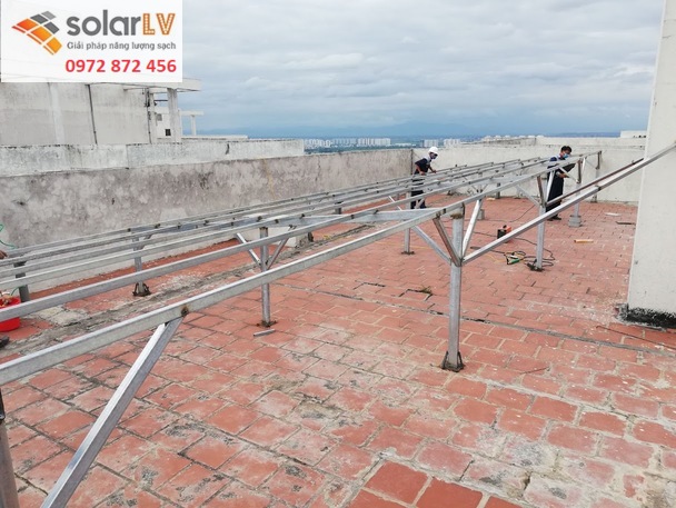 Lắp đặt khung thép và ray nhôm: Khung thép trên mái sử dụng thép mạ kẽm chống ăn mòn, kết hợp với ray nhôm chất lượng cao để cố định tấm pin. Hệ thống được neo chắc chắn vào mái bê tông của chung cư, đảm bảo tuân thủ các quy định kỹ thuật và an toàn.