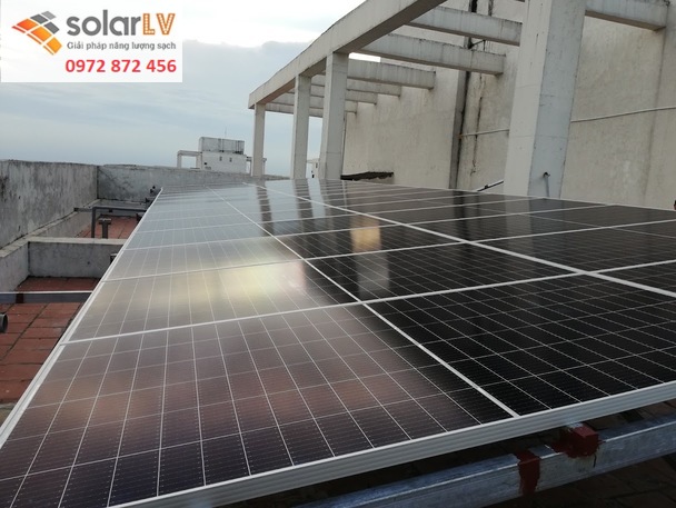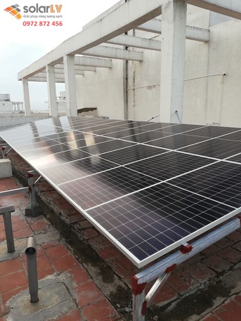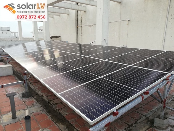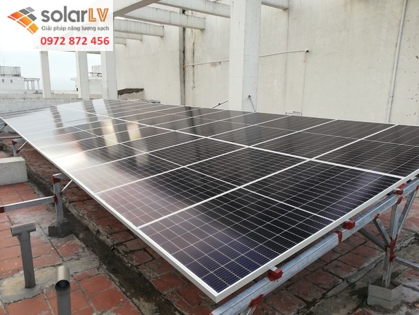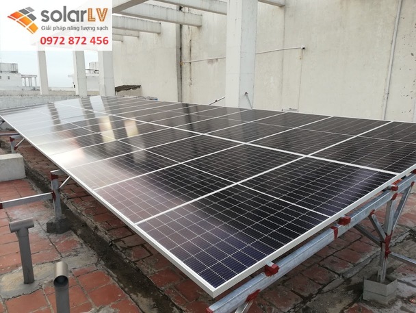 Khảo sát và thiết kế: Đội ngũ kỹ thuật của Long Vũ tiến hành khảo sát mái chung cư, đánh giá khả năng chịu tải cho 30 tấm pin mặt trời Canadian 550W (mỗi tấm ~2.3m x 1.1m, trọng lượng ~25kg). Góc nghiêng khung thép được tối ưu (~25-30 độ) để phù hợp với vĩ độ Hà Nội, đảm bảo hấp thụ tối đa ánh sáng mặt trời.