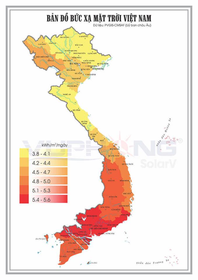 - Hiện nay khí hậu khu vực miền Bắc cũng đã thay đổi rõ rệt với số giờ nắng trung bình trong năm đã tăng rõ rệt, từ 1500-1700 h/năm. Theo bảng phân tích và thống kê dữ liệu của tổ chức về môi trường và biến đổi khí hậu thuộc Ủy ban Châu Âu thì khu vực Hưng Yên, Hà Nội, lượng bức xạ đo được cũng khá là cao, sản lượng điện có thể sinh ra 4,0 - 4.5kWh /m2/ngày.