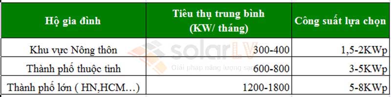 Khu vực nông thôn hiện nay cũng đã có nhiều Hộ gia đình đầu tư hệ thống điện năng lượng mặt trời,ngoài việc sử dụng cho mục đích sinh hoạt các gia đình này còn sử dụng cho các mục đích tưới tiêu,vệ sinh chuồng trại, thắp sáng trong nông nghiệp .Để lựa chọn được công suất lắp đặt Hệ thống điện mặt trời sao cho phù hợp thì ta phải biết được chi tiết công suất các phụ tải đang sử dụng. Nếu chỉ dùng cho sinh hoạt không thì mức tiêu thụ ở khu vực nông thôn chỉ vào khoảng 300 -400 kWh /tháng, Hộ gia đình ở khu vực thành phố thuộc tỉnh thì dùng trung bình khoảng 600-800 kWh/tháng do sử dụng điều hòa ( ví dụ TP Thanh Hóa,TP Vinh,TP Bắc Ninh....), nhà ở các Thành phố lớn thì trung bình 1000 -1600 kWh/tháng do sử dụng cả điều hòa cùng nhiều các thiết bị tiện ích khác trong gia đình ( ví dụ TP Hà Nội, TP Hồ Chí Minh...)