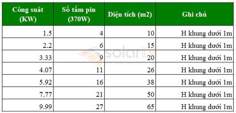 Bảng 3 – Số tấm pin bạn cần và diện tích lắp đặt theo công suất lựa chọn