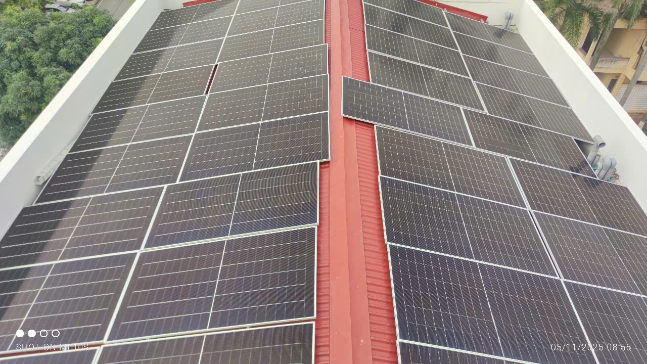 Thiết bị chính: Tấm pin Mono Half-cell hiệu suất cao, Inverter hòa lưới công nghiệp (Deye/Huawei/Growatt), hệ thống tủ điện điều khiển thông minh và dàn khung chuyên dụng cho mái tòa nhà.
