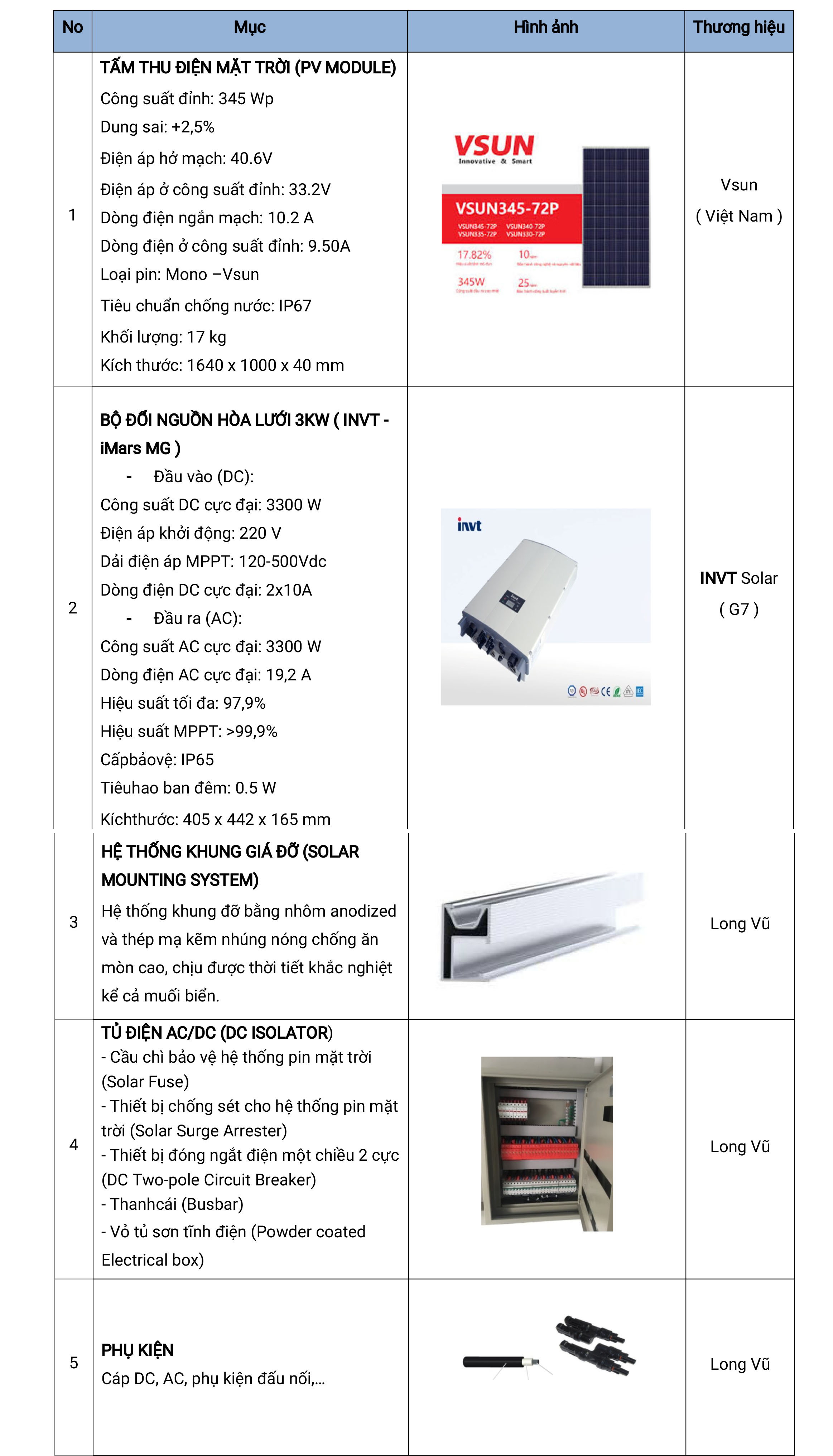 -Lắp đặt hệ thống điện mặt trời hòa lưới 3KW sẽ bao gồm các thiết bị cơ bản sau :