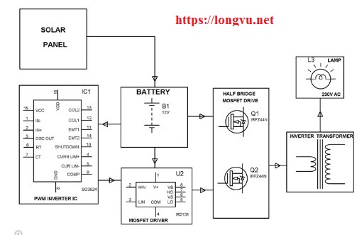 Trong hệ thống đề xuất này, năng lượng mặt trời được lưu trữ trong pin từ các tế bào PV. Năng lượng này của pin được thay đổi thành nguồn cung cấp AC tần số 50Hz bằng cách sử dụng IC biến tần PWM với MOSFET cho cầu điều khiển MOSFET và tăng cường điện áp bằng một máy biến áp, tất cả chỉ ở dạng n / w ngoại tuyến chứ không phải loại nối lưới.