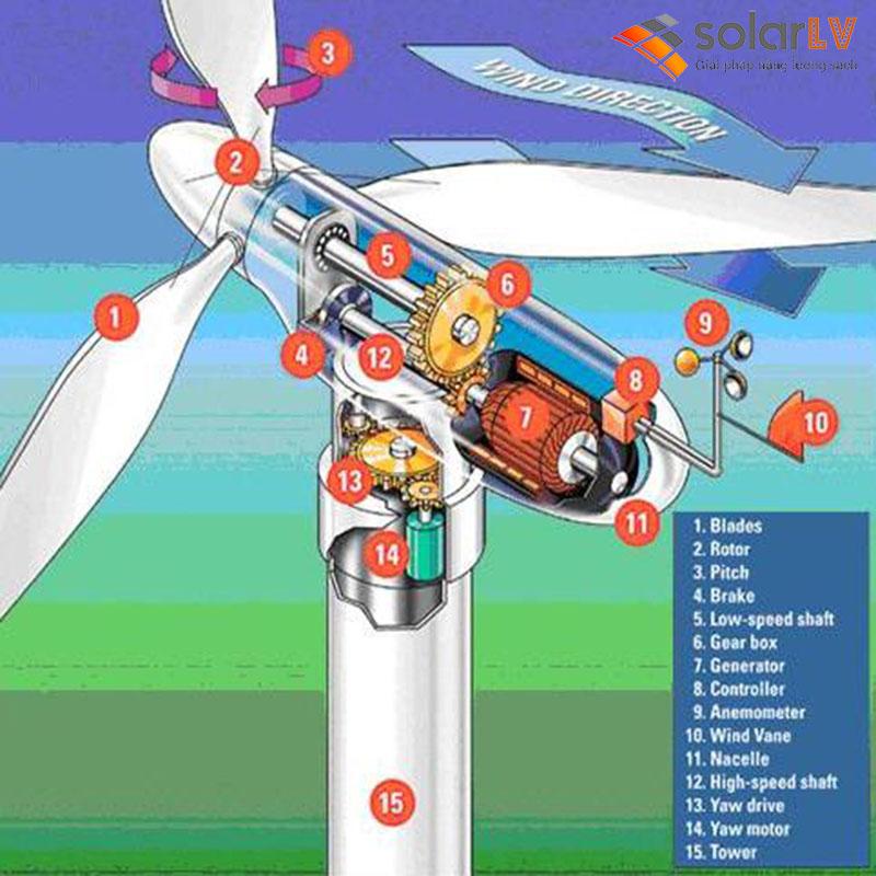 Khi gió đập vào cánh quạt, cánh quạt bắt đầu quay. Rôto tuabin được kết nối với hộp số tốc độ cao. Hộp số biến đổi vòng quay của rôto từ tốc độ thấp sang tốc độ cao. Trục tốc độ cao từ hộp số được ghép với rôto của máy phát và do đó máy phát điện chạy ở tốc độ cao hơn. Một exciter cần thiết để cung cấp sự kích thích cho cuộn từ tính của hệ thống từ trường máy phát để nó có thể tạo ra điện . Điện áp được tạo ra tại các đầu ra của máy phát điện tỷ lệ thuận với cả tốc độ và từ thông của máy phát. Tốc độ bị chi phối bởi năng lượng gió ngoài tầm kiểm soát. Do đó để duy trì tính đồng nhất của công suất đầu ra từ máy phát điện, kích thích phải được kiểm soát theo sự sẵn có của năng lượng gió tự nhiên. Dòng kích từ được điều khiển bởi bộ điều khiển tuabin cảm nhận tốc độ gió. Sau đó, điện áp đầu ra của máy phát điện ( máy phát điện ) được cấp cho bộ chỉnh lưu trong đó đầu ra của máy phát điện được chỉnh lưu thành DC. Sau đó, đầu ra DC được chỉnh lưu này được cung cấp cho bộ chuyển đổi đường dây để chuyển đổi nó thành đầu ra AC ổn định, cuối cùng được đưa vào mạng truyền tải điện hoặc lưới truyền tải với sự trợ giúp của máy biến áp tăng cường . Một đơn vị bổ sung được sử dụng để cung cấp năng lượng cho các phụ trợ bên trong của tuabin gió (như động cơ, pin , v.v.), đây được gọi là Đơn vị cung cấp nội bộ.
