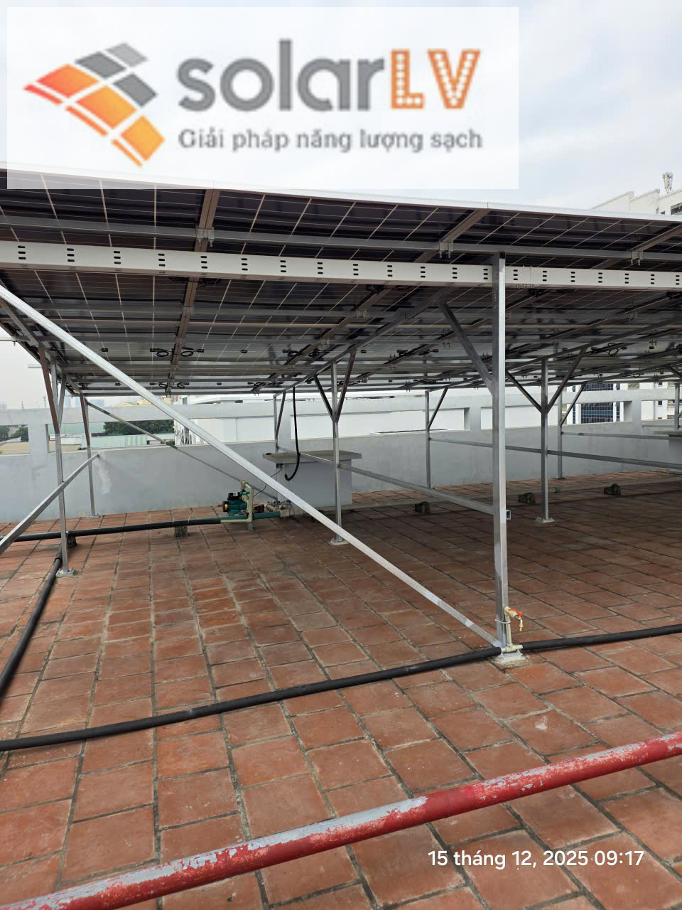 Lắp đặt khung giá đỡ: Thi công phần móng trụ, giàn khung đảm bảo độ dốc tối ưu (10-15 độ tại Việt Nam) để thu năng lượng tốt nhất.