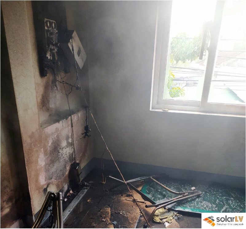 Hình ảnh 1: Iventer và cầu dao của hệ thống điện mặt trời bị cháy do chưa đủ hiểu biết về điện mặt trời đã mua thiết bị về và tự lắp đặt