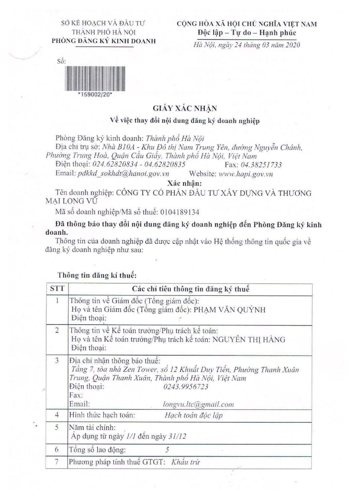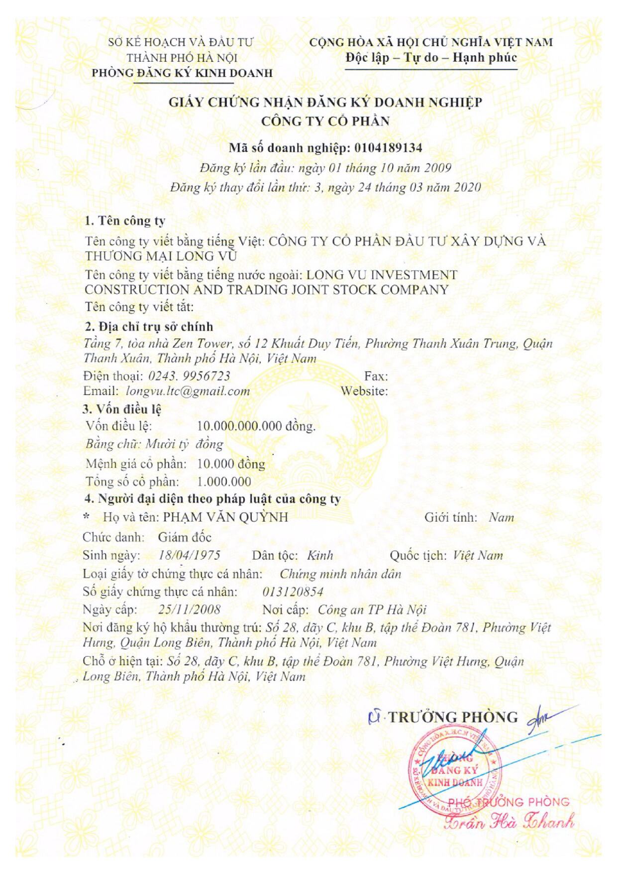 Giấy phép kinh doanh: 0104189134 – cấp lần đầu ngày 01/10/2009 bởi Sở KH&ĐT Hà Nội.